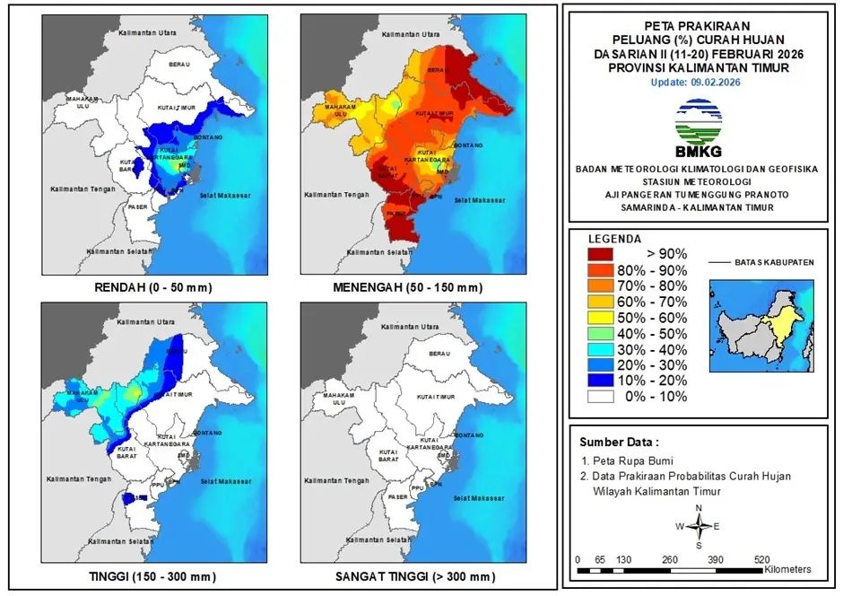 BMKG juga mencatat hingga pembaruan data per 10 Februari 2026, hari tanpa hujan di Kaltim tergolong sangat pendek, yakni hanya 1-5 hari. Kondisi ini menunjukkan aktivitas hujan masih cukup sering terjadi di wilayah tersebut.
